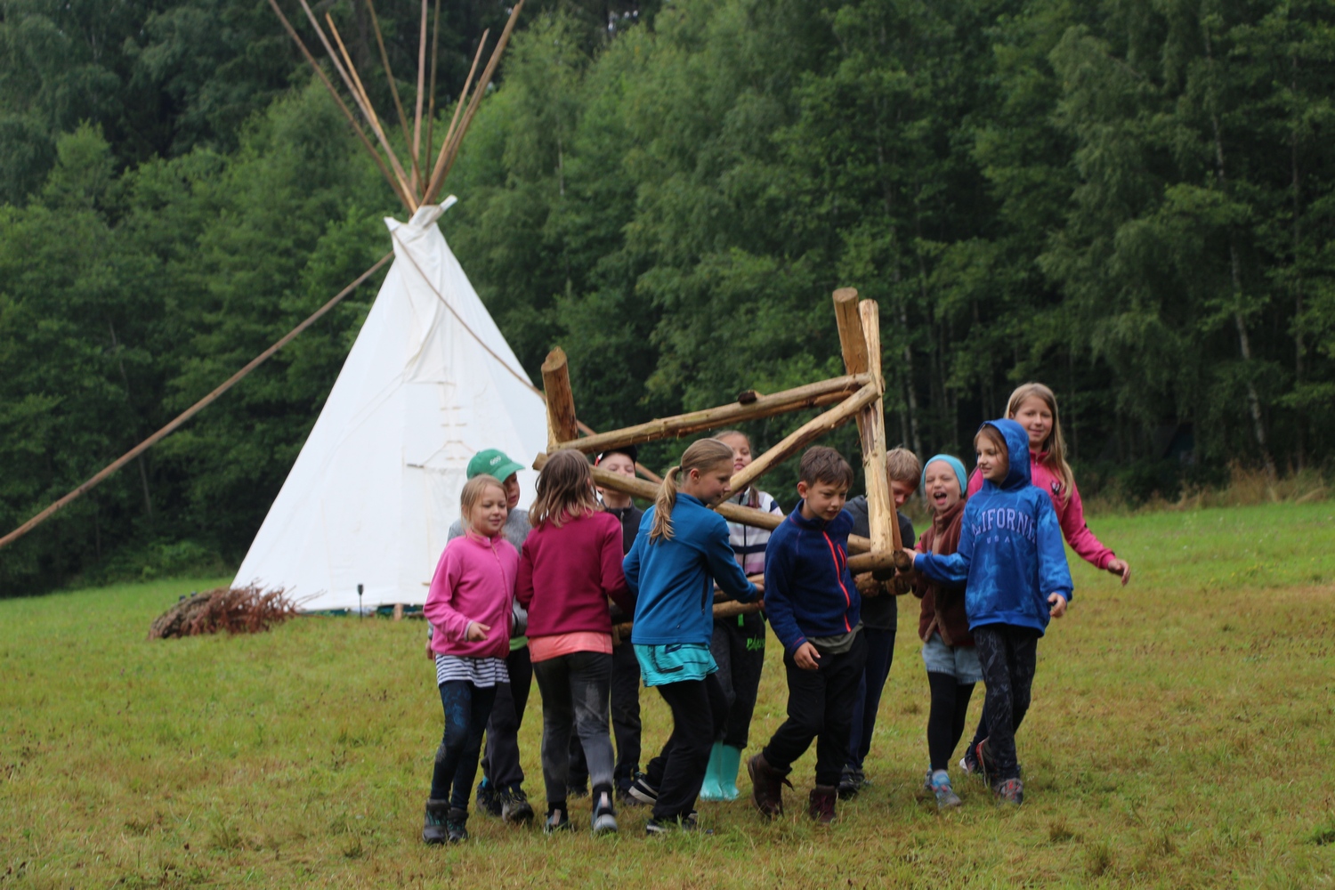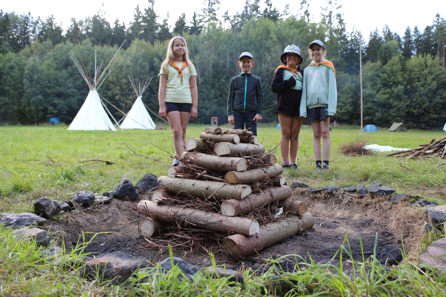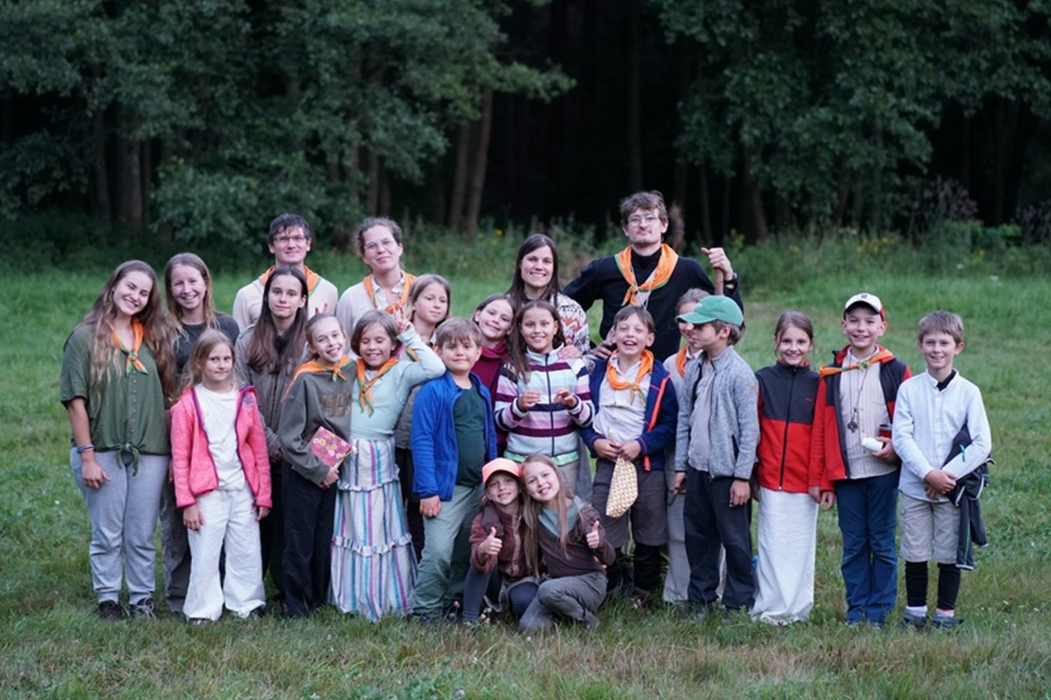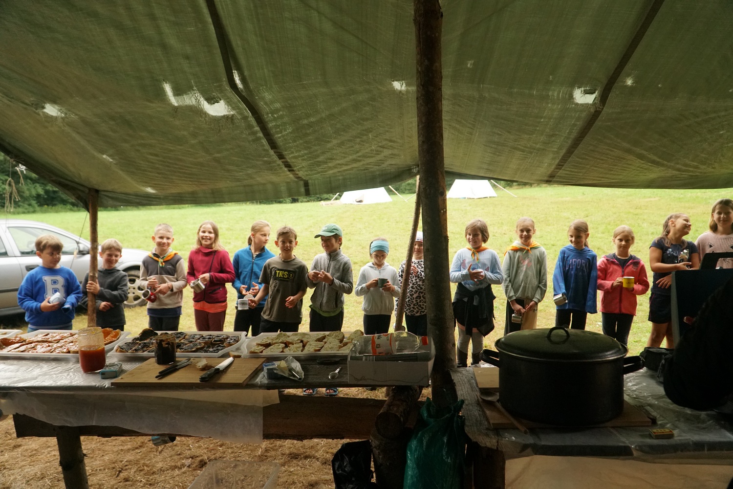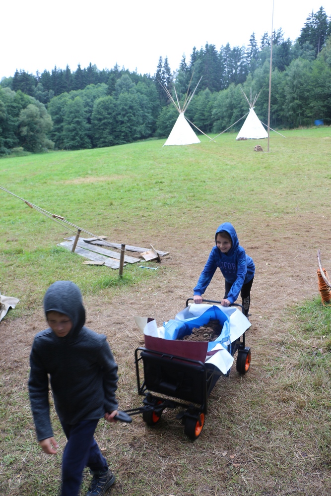 Na závěr patří velké díky všem táborníkům, kteří přiložili ruku k dílu – při stavbě i bourání tábora, při hrách i při každodenním fungování. Máje z Popcornu za pohlídání tábořiště během puťáku, Georgymu za sehnání železného plátu na kamna, Adamovi za pomoc s odvozem věcí z tábořiště k autobusu a mnohým dalším, co se jakkoli podíleli na tom, aby byl tábor takový, jaký byl. Rodičům děkujeme nejen za důvěru, ale i za pomoc s odnášením hromady věcí z autobusu až do klubovny. Zejména po vyčerpávajících dnech bourání kombinovaného s dostavováním lávky přes brod a vydatnými dešti to bodlo.