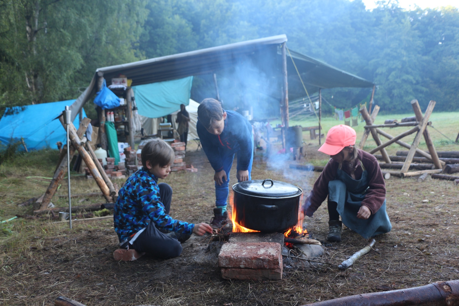 Naše crewT zvládla neuvěřitelné věci. Vařilo se na vlastnoručně postavených kamnech, na kotlíku i na grilu. Byly ovocné knedlíky, langoše. Dokonce se nám dobře povedl i experiment: smažený sýr dělaný v kotlíku (vážně to jde!) s bramborami na všechny způsoby či s rýží – to vše v rámci programu „Restaurace u Houmra“, kde si děti navíc postavily stoly ze dřeva, kamenů a cihel, vyrobily cedule, vlastní oběživo.